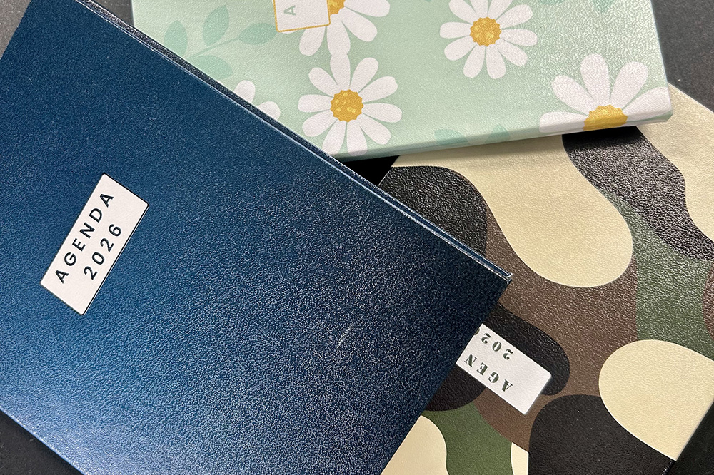 blocs-notes, carnets, agendas, protections de bureau personnalisables (sous-mains), marque-pages.
